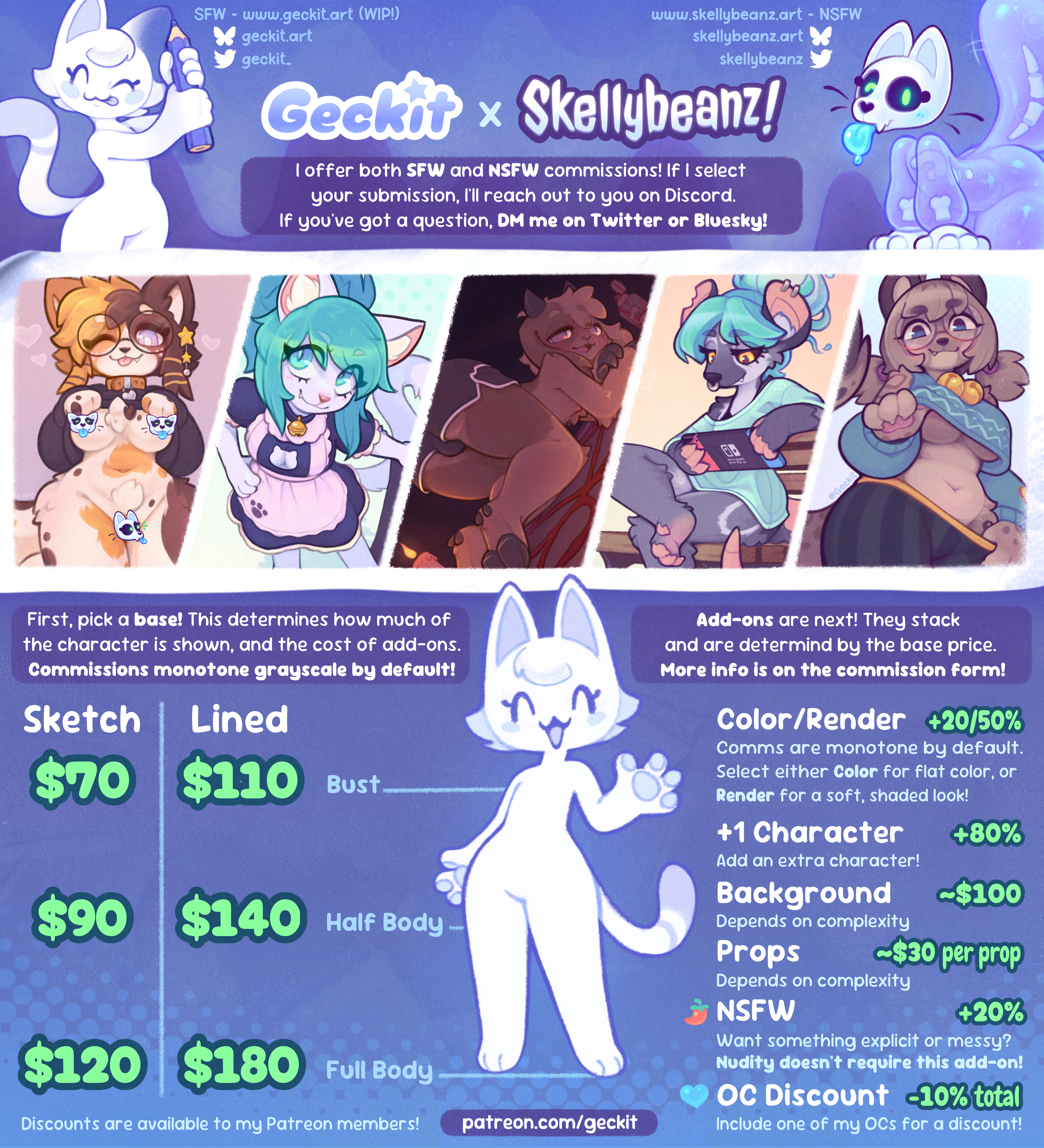 The commission sheet below summarizes my prices and options, click it for a better look! Commission requests are submitted through my Google Form. Check out my Commission Gallery for examples of my work! And my T.O.S. will tell you about my process and what I do/don't draw.Got a question? Reach out and DM me on my socials!